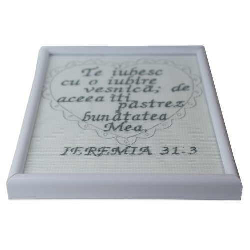 Tablou din material textil, brodat, cu mesaj crestin, 20.5 x 15.5 cm - "Te iubesc cu o iubire vesnica"
