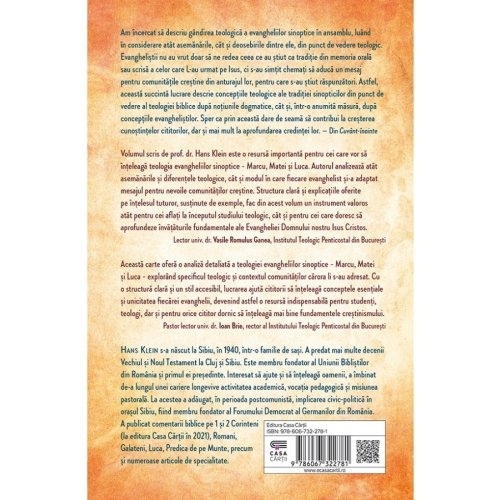 „Volumul scris de prof. dr. Hans Klein este o resursă importantă pentru cei care vor să înțeleagă teologia evangheliilor sinoptice – Marcu, Matei și Luca. Autorul analizează atât asemănările și diferențele teologice, cât și modul în care fiecare evanghelist și-a adaptat mesajul pentru nevoile comunităților creștine. Structura clară și explicațiile oferite pe înțelesul tuturor, susținute de exemple, fac din acest volum un instrument valoros atât pentru cei aflați la începutul studiului teologic, cât și pentru cei care doresc să aprofundeze învățăturile fundamentale ale Evangheliei Domnului nostru Isus Cristos.” -- Pastor lector univ. dr. Vasile Romulus Ganea, Institutul Teologic Penticostal din București