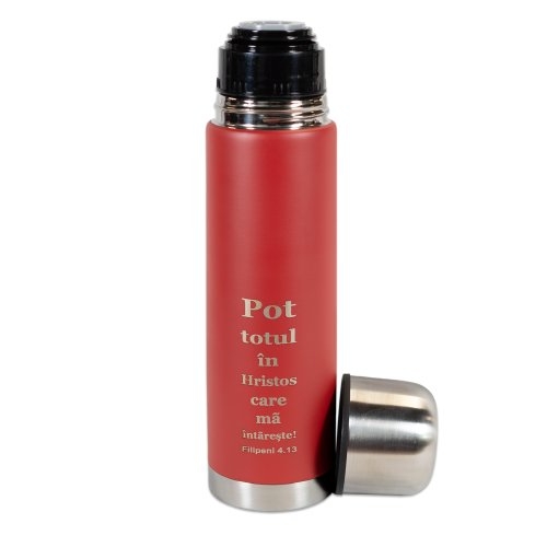 Termos - Pot totul in Hristos (rosu cu capac argintiu)