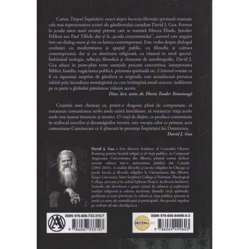 Cartea Timpul Imparatiei: eseuri despre bucuria libertatii spirituale reuneste cele mai reprezentative scrieri ale ganditorului canadian David J. Goa. Format la scoala unor mari savanti printre care se numara Mircea Eliade, Jaroslav Pelikan sau Paul Tillich, dar si la "scoala crestinismului", autorul este angajat intr-un dialog onest si viu cu lumea contemporana. Este vorba despre dialogul credintei cu modernitatea si spatiul public, cu filosofia si cultura contemporana, dar si cu alteritatea religioasa, cu islamul in mod special. Imbinand teologia, reflectia filosofica si elemente de autobiografie, David J. Goa aduce in prim-plan teme esentiale precum convertirea, interpretarea Bibliei, familia, rugaciunea publica, prietenia spirituala etc. Cititorul roman va fi cu siguranta surprins de gandirea sa originala, care actualizeaza porunca iubirii prin increderea nemarginita cu care intampina omul concret, indiferent pe ce parte a globului pamantesc traieste acesta.