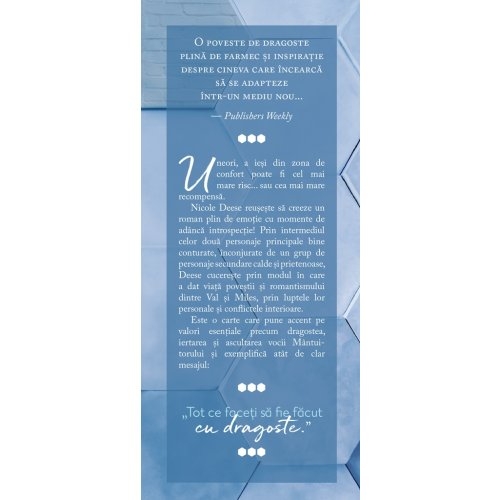 Un roman plin de emotie cu momente de adanca introspectie! Prin intermediul celor doua personaje principale bine conturate, inconjurate de un grup de personaje secundare calde si prietenoase, Deese cucereste prin modul in care a dat viata povestii si romantismului dintre Val si Miles, prin luptele lor personale si conflictele interioare.