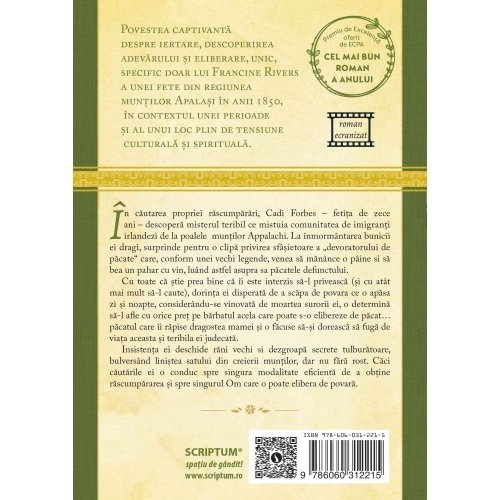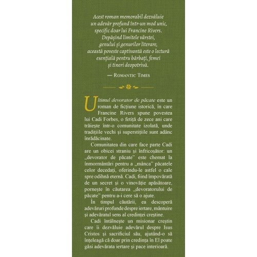 Ultimul devorator de pacate este un roman de fictiune istorica, in care Francine Rivers spune povestea lui Cadi Forbes, o fetita de zece ani care traieste intr-o comunitate izolata, unde traditiile vechi si superstitiile sunt adanc inradacinate.