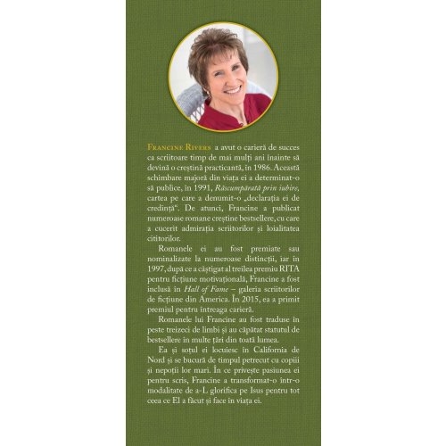 Francine Rivers a avut o cariera de succes ca scriitoare timp de mai multi ani inainte sa devina o crestina practicanta, in 1986. Aceasta schimbare majora din viata ei a determinat-o sa publice, in 1991, Rascumparata prin iubire, cartea pe care a denumit-o „declaratia ei de credinta“. De atunci, Francine a publicat numeroase romane crestine bestsellere, cu care a cucerit admiratia scriitorilor si loialitatea cititorilor.