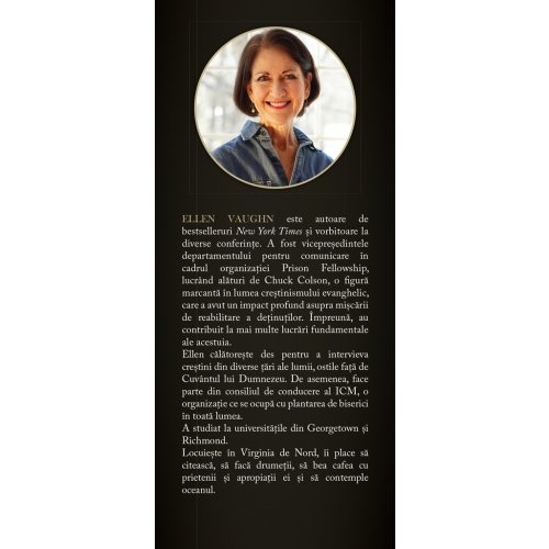 ELLEN VAUGHN este autoare de bestselleruri New York Times si vorbitoare la diverse conferinte. A fost vicepresedintele departamentului pentru comunicare in cadrul organizatiei Prison Fellowship, lucrand alaturi de Chuck Colson, o figura marcanta in lumea crestinismului evanghelic, care a avut un impact profund asupra miscarii de reabilitare a detinutilor. Impreuna, au contribuit la mai multe lucrari fundamentale ale acestuia.