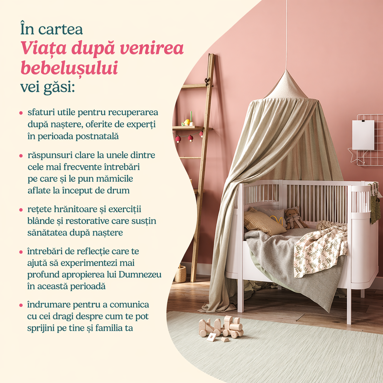 - îți revitalizezi sănătatea prin rețete hrănitoare și informații nutriționale dedicate perioadei postpartum