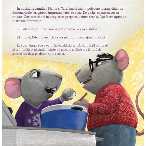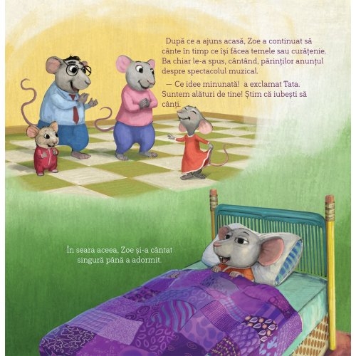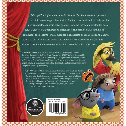 Micuței Zoe îi place foarte mult să cânte. Ea cântă mereu și peste tot. Există însă o mică problemă: Zoe cântă fals. Într-o zi, se înscrie la audiție pentru spectacolul muzical al școlii și le spune încântată prietenilor ei că sigur va fi selectată pentru rolul principal. Când ceea ce ea aștepta nu se întâmplă, Zoe se simte jenată, rușinată și își dorește doar să se ascundă. Fiind parte a seriei Vestea bună pentru inimi micuțe cartea Zoe strălucește oferă ajutorul de care avem nevoie atunci când ne confruntăm cu rușinea.